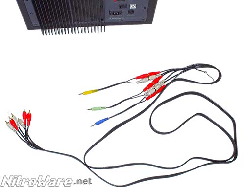 To connect the speakers to a PC the three stereo cables are combined with the bundled stereo RCA to 3.5mm adapters to pluged into a PC that supports six or more channels of audio.